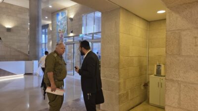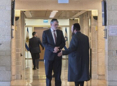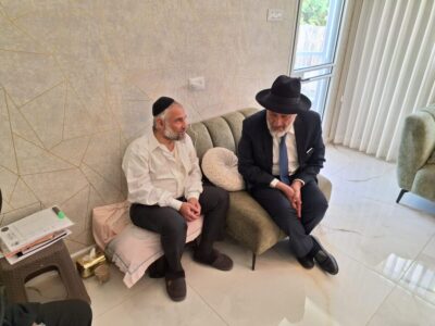 מן השמיים ינוחם: חברי הכנסת מנחמים את חבר הכנסת מש"ס היושב שבעה על פטירת אמו. חרדים ירושלים מצטרפים לתנחומים. בתמונה נראים גולדקנופף בבצ'יק ואייכלר. תמונה נדירה יחסית ברקע היחסים המורכבים בין גור לבעלזא בנושא חוק הגיוס